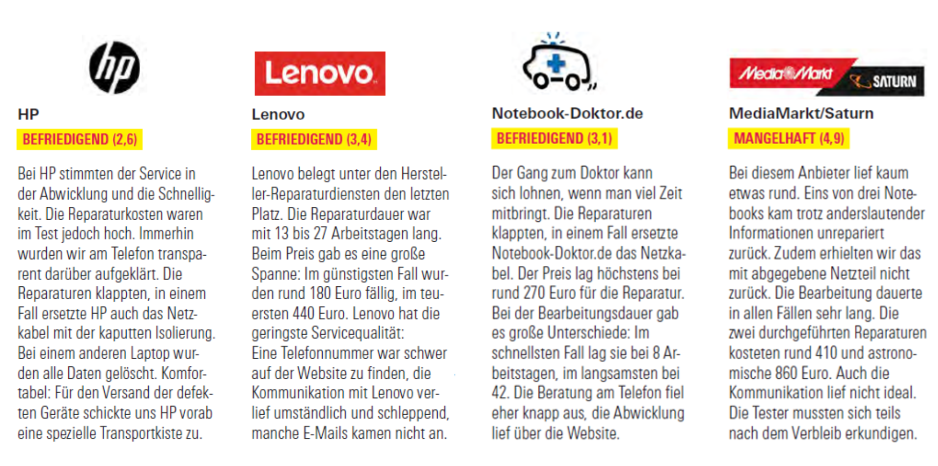 Die Tester lobten bei IPC die hohe Teileverfügbarkeit, die solide Reparaturqualität und die kompetente Arbeitsweise der Techniker. Kritikpunkte bei Media Markt betrafen dagegen lange Wartezeiten, unpräzise Diagnosen und eine unklare Kommunikation über mehrere Zwischenstationen hinweg.