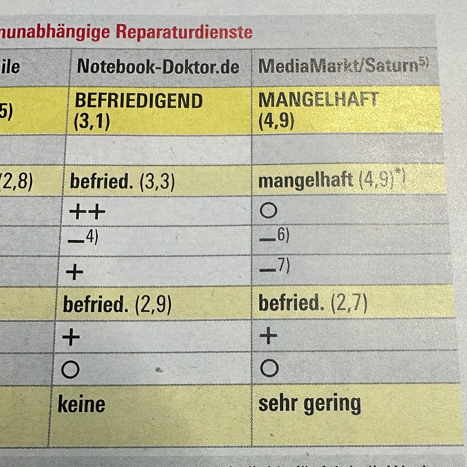 | ✅ Originalteile dank direkter Herstellerbeziehungen (Acer, Asus, Lenovo, Dell, MSI, HP u.a.) | ❌ Ersatzteilversorgung i.d.R. über Großhändler, wenig Ersatzeile-Lagerbestände in den Filialen |