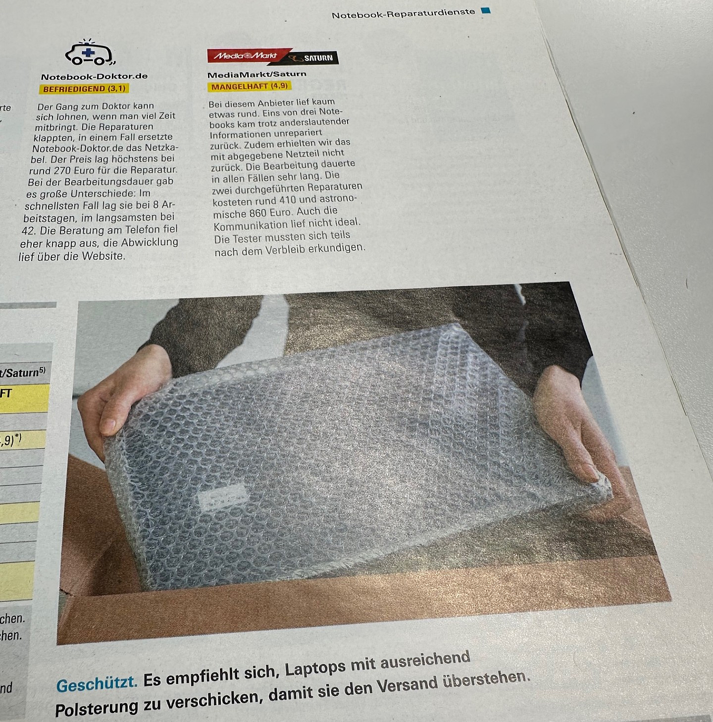 Ein wichtiger Punkt: Die einzelnen Media‑Markt‑Filialen verfügen über keine tiefen Laptop Ersatzteil‑Lagerbestände. Benötigte Komponenten werden meist über den Elektronik‑Großhändler und auch Hersteller beschafft. Da diese Versorgungskette von externen Partnern abhängt, kann es zu längeren Lieferzeiten kommen – Stiftung Warentest urteilt: „Die Bearbeitung dauerst in allen Fällen sehr lang“.