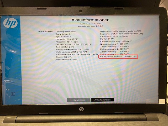 Auch wenn die CT Nr. auf beiden Aufkleber steht, bedeutet das nicht, dass dies ein Original-Akku ist. Diese kann man aber mit dem HP PC Hardware-Diagnostic UEFI Tool auslesen. Die Ergebnisse seht ihr auf den untenstehende Abbildungen.